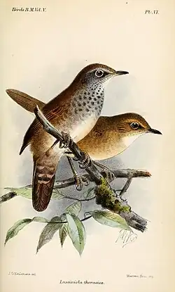 The spotted bush warbler (Locustella thoracica) is a species of Old World warbler in the family Locustellidae. It is found in the northern Himalayas, Yunnan and central China, in the countries of Bangladesh, Bhutan, China, India, Myanmar and Nepal.[2] Its natural habitat is arboreal forests.