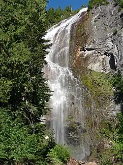 Spray Falls is a waterfall in the Mount Rainier National Park in Pierce County, Washington. The falls are fed by Spray Creek, which is a tributary of the Puyallup River. The falls drop about 354 feet (108 m) into a talus slope in a vailed horsetail form about 100 feet (30 m) wide.[1]