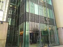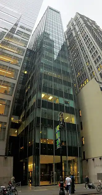 The building's facade is an early example of a glass curtain wall, a non-structural facade in front of the steel structural frame.[29] Its design incorporated elements from similar nearby projects such as the United Nations Secretariat Building at First Avenue (1947), Lever House at Park Avenue (1950–1952), and the Corning Glass Building at Fifth Avenue (1959).[33] The Secretariat Building had used double-glazed green-tinted glass,[34]: 127–128 while the Lever House used both glazed fixed-panel windows as well as interspersed sections of tinted-green and dark-green glass.[35] The Corning Glass Building, another Harris and Abramovitz project, used sheets of "translucent glass in front of painted metal panels"[29] as well as interlocking mullions made of aluminum.[34]: 154, 304 [29]