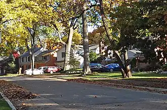 There are four hundred four contributing houses and duplexes in the neighborhood (and eight noncontributing houses), fifteen contributing apartment buildings (and twenty non-contributing apartment buildings) a shopping center with a two contributing, and two non-contributing buildings, and seven contributing parks. The shopping center is located at the southeast corner of the district, and the contributing apartment buildings are located to the west of the shopping center on the south portion of the district. Parks are equally spaced throughout the neighborhood; all but one (Bennington Park) are on the interior of the blocks.[2]