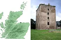 English prisoners were held at Spynie during the war known as the Rough Wooing, including Edward Sutton, 4th Baron Dudley who was taken at Hume Castle in December 1548.[23] Christopher Rokeby, an agent provocateur of Elizabeth I of England, who had tried to lead Mary, Queen of Scots, into a plot with English Roman Catholics, was imprisoned in Spynie Castle in 1566 for eighteen months during Bishop Patrick Hepburn's tenure.[24] Hepburn fell foul of the Privy Council for sheltering his relative Bothwell at Spynie in 1567 who had fled from the battle of Carberry Hill first to Huntly Castle. Bothwell sailed to Orkney and Shetland, and finally to Denmark.[25][26]