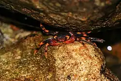The Sri Lanka tree crab, (Perbrinckia scansor), is a species of freshwater crabs of the family Gecarcinucidae that is endemic to Sri Lanka. It is the only known tree climbing freshwater crab found in the country. The crab is discovered from 11 localities from Sri Lanka throughout Kalu River, Walawe River and Gin River basins. Adults are known to survive well in rainwater-filled tree hollows of trees such as Shorea sp., Artocarpus sp., Dillenia sp., Garcinia sp., Myristica sp., and Gyrinops walla. Females with young can be seen during February and March on the ground, never within tree hollows. The known predators are Greater coucal, White-throated kingfisher, Sri Lanka grey hornbill and Eurasian otter.[1]