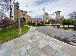 Soon after her death in 1903, a site was chosen for the Lane-Johnston Building, and the foundation stone was laid in June 1905. By 1907, construction was virtually complete on the new building, which housed everything—classrooms, the dining hall, the headmaster’s study, and a 40-bed dormitory—but the chapel: the Bishop of Washington repurposed an adjacent repository for cathedral furnishings into the Little Sanctuary, adding a bell tower and an archway.[5]