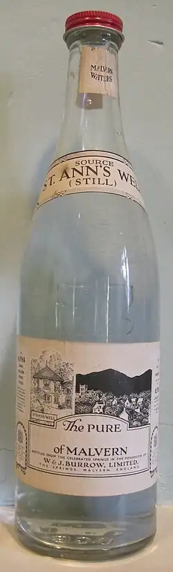 In the 1850s, water from St Ann's Well was bottled by John and William Burrow at the Bottling Works Spring in Robson Ward's yard on Belle Vue Terrace in Great Malvern. Bottling ceased here in the 1950s and the former bottling works are now furniture showrooms. Water for the Bottling Works Spring is piped from St Ann's Well.[13]