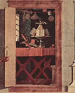 Many of the objects in the study would usually go unnoticed; however, Vittore Carpaccio chose to display the cabinet in the back left of the painting with the doors wide open and the shelf under the altarpiece with the curtain pulled back in order to allow the viewer to see more in depth into the life of St. Augustine.[2] The door has a lock and key in it to reflect contemporary practices of locking up books since they were considered sacred books.[2] Many other objects are carefully positioned around the study in order to display the collection of St. Augustine.[2] Scholars have argued that the impressive variety of items from the arts, sciences, astronomy, and theology, drawn from different places and historical times, symbolizes the active, intellectual mind of St. Augustine.[1]