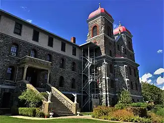 The two-foot-thick walls of local blue porphyry are characteristic of the Romanesque Revival style. The structure rests on a three-quarter-story stone foundation, with a grand stairway leading to the balustraded front entry porch, presenting an imposing view. The chapel is divided along its length into seven bays supported by abbreviated buttresses, with a two-story arched window and oval window above in each bay, with surrounds of locally made brick.[2] The statue in the niche above the chapel's rear entry is of Saint Gertrude of Helfta, to whom the nunnery is dedicated.