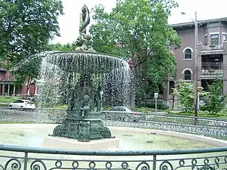 The St. James–Belgravia Historic District, within Old Louisville, was placed on the National Register of Historic Places in 1972. It comprises St. James Court (north) and Belgravia Court (south). It is bordered to the north by Louisville's Central Park. The area was the site of the Southern Exposition and now hosts the St. James Court Art Show which takes place annually the first weekend of October. Belgravia Court takes its name from Belgravia, an affluent district in London, England. Belgravia Court has no immediate street access for vehicles and is a "walking court" with a common green area and parallel sidewalks.[2][3] St. James Court features two important houses: the Conrad–Caldwell House, and the Pink Palace.