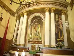 The church is a single-nave church covered with a barrel vault, which opens with three side chapels through a half-point arch. Two small domes rise on each side of the transept. The main apse is polygonal. In the re-decoration there is a remarkable and innovative element for the churches of this period. There is a double tribune, one that communicates with the Montclar Castle, and another lower one corresponding to the church itself. The entrance to the church is at the foot of the west wall, through a large staircase and a semi-circular arch made of bricks. The bell tower is quadrangular and subdivided into three floors. On the first floor there are half-point openings that house the bells and on the top floor there is a clock on each face of the tower. It is made of perfectly cut regular ashlars and is crowned with a pyramidal roof.[1]