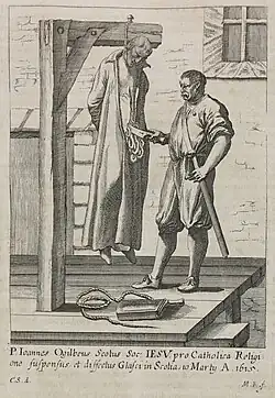 In the midst of the religious controversies and turmoil that engulfed the Europe of that era, he decided to become a Catholic. In 1597, aged seventeen, he was received into the Catholic Church by Cornelius a Lapide S.J., professor of sacred scripture at Leuven, Belgium. Ogilvie joined the Society of Jesus in 1599 and was ordained a priest at Paris in 1613.[1] After ordination he served in Rouen in Normandy where he made repeated requests to be sent to Scotland to minister to the few remaining Catholics in the Glasgow area. (After the Scottish Reformation in 1560 it had become illegal there to preach, proselytise for, or otherwise endorse Catholicism.)[2]