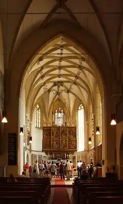 The main altar, located in the choir of St. Margaret's church, is a late Gothic winged altarpiece, dated between 1480 and 1520. Its work-day (closed) view is adorned with eight painted panels depicting the passion of Christ.[7] On the northern walls of the nave and north aisle, frescoes were discovered under layers of white paint, and partly restored.[8] In the choir, eight grave slates are on display today, one of them commemorating the pastor, poet and humanist Christian Schesaeus (1535–1585). Various wooden and painted epitaphs adorn the interior of the church. St. Margaret's church also houses one of the largest collections of "Transylvanian" rugs, 16th–18th century Anatolian rugs in Europe.[9]