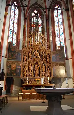 The church's high altar is from 1483.[4] The monochrome carved wooden altar was attributed to the workshop of Master Hans (Bilger) from Worms, but this is not confirmed, and comparison to other works by him raises doubts. The altar is the highest and first monochrome carved altar in Germany.[1][2]
