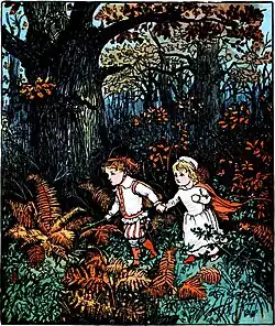 A modern version of the tale links the green children with the Babes in the Wood. Although there are differing stories, a common motif is that they are left or taken to die in the woods—often identified as Wayland Wood or Thetford Forest—after being poisoned with arsenic by their uncle. The arsenical poisoning resulted in their colouration; they became further linked with the Woolpit children after escaping the woods, but falling into the pits before their ultimate discovery. This version of the story was known to local author and folk singer Bob Roberts, who says in his 1978 book A Slice of Suffolk "I was told there are still people in Woolpit who are 'descended from the green children', but nobody would tell me who they were!"[1]