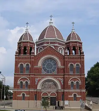 When Fr. A.L. Leininger became pastor of the parish in 1893, the church building was too small for the needs of the parish, despite being enlarged twice before. Rather than adding onto the existing structure, Leininger decided to build a new church in the Italian Renaissance style, similar to St. Peter's and St. Mark's.[3] Work began on the church on January 16, 1897, the cornerstone was laid by bishop John Watterson of Columbus on July 10, 1898, and dedicated by bishop Leo Haid, O.S.B., Vicar Apostolic of South Carolina, on August 27, 1899 as Watterson had died a year prior.[3][5] The distinctive dome of the church has dominated the Zanesville skyline ever since.[5]