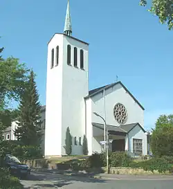 After World War II around 180 people gathered for services, first in the villa of the entrepreneur and politician Florian Klöckner. In 1948 a property was found on which to build a church. The architect was Alfred Kalmbacher, whose second design was approved in June 1951. The building was managed by St. Clemens.[1] The new church was consecrated on 26 September 1954 by Franz Hengsbach. [1]: 6  An organ was built in 1956 by Anton Feith.