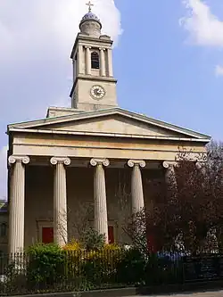 St. Peter's Church, Eaton Square, is a Church of England parish church at the east end of Eaton Square, Belgravia, London. It is a neoclassical building designed by the architect Henry Hakewill with a hexastyle portico with Ionic columns and a clock tower. On 19 October 1991 The Times newspaper wrote "St Peter’s must now rank as one of the most beautiful churches in London". It is a Grade II* listed building.[1]