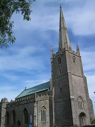 The church was remodelled in the 15th century, in a Perpendicular style; further restorations followed in 1825, 1856 and 1950–2.[1] The nave includes pillars with decorated stone corbels supporting the wooden roof timbers and carved bosses. The organ, which was rebuilt in 1967 is in the chancel. The Merle chapel was formerly known as the Chapel of St Congar. The font is Norman. The tower is surmounted by a spire which rises to 120 feet (37 m).[5]