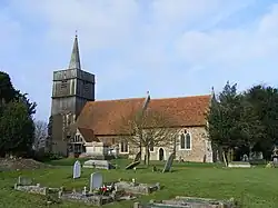 The current west tower and small spire are 16th century but may represent a rebuild of one from the later 14th century. Its base is of brick and rubble and the upper two-thirds of timber. The south porch is also 16th century, whilst the font cover is early 17th century.[3] The whole building was restored in the 19th century.