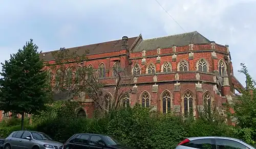 St Saviour's Church was a slightly earlier church which stood (at 50°50′10″N 0°08′02″W / 50.8360°N 0.1339°W) on Ditchling Road in the Round Hill area of Brighton, southeast of St Augustine's. It was built by local architects Edmund Scott and Frank Cawthorn in 1886 in the Early English style, in flint, stone and red brick.[4] It was extended in 1889, but a proposed tower was never built.[5] Declared redundant and closed in 1981, it was demolished in 1983 and replaced by flats. The former parish was then absorbed by that of St Augustine's Church.[6] The Diocese of Chichester in turn declared St Augustine's redundant as from 22 January 2003,[7] and it officially closed in 2003.[3] It has stood empty since then. The parish, now called St Augustine and St Saviour, was added to that of St John the Evangelist's Church, the parish church of Preston Village, whose parish was renamed "Preston, St John the Evangelist with Brighton, St Augustine and St Saviour" accordingly.[8]