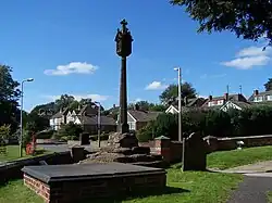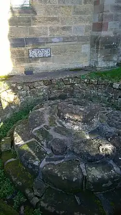 In the churchyard are the remains of two ancient crosses. One of these, to the south of the church, is known as Lady Godiva's cross.[10] It was rediscovered in 1912 when the other cross, dating from the medieval period, was being restored; the medieval cross was found to be standing on an Anglo-Saxon cross base. The medieval cross has been moved to a different position to the west of the church.[10] It is considered that Lady Godiva's cross was built by Leofric, Earl of Mercia, the husband of Lady Godiva, when he was lord of the manor.[3] All that remains of it consists of three round steps and part of a round shaft. A plaque on the wall of the church states that it was used by the itinerant priests of Dudley Priory. It is designated as a Grade II listed building and a scheduled monument.[11][12] The medieval cross is also listed at Grade II and is a scheduled monument. It is constructed in sandstone, and consists of three steps, a socket stone, and a shaft. The carved head was added in the 20th century.[13][14]