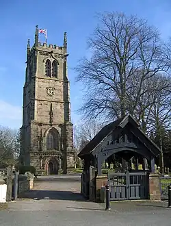 1. ^ a b c d Historic England, "Tower of former Church of St Chad, Wybunbury (1279389)", National Heritage List for England, retrieved 27 September 2011