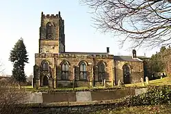 The church is built of millstone grit with a Welsh slate roof, and is in Gothic Revival style. It consists of a nave, north and south aisles, a chancel with a north aisle and a south vestry, and a west tower. The tower has two stages, diagonal buttresses rising to pinnacles, two-light bell openings with hood moulds, and an embattled parapet. The aisles also have embattled parapets, and the windows are in Perpendicular style with hood moulds. Inside, the nave has two galleries, and there are assorted wall monuments, the earliest dating from 1686. The east window of the north aisle has stained glass manufactured by William Holland in 1858.[2][4]