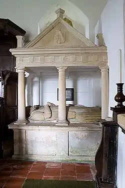 On the sanctuary's north wall is the late 16th-century limestone chest tomb of Henry and Mary Stafford. Mary Stratford's effigy appears to have been resized to fit the space.[3] On the west wall is an Early English font with circular bowl on top of four pillars. There is a small piscina sitting on a column to the left of the altar. Most of the furnishings are from the Jacobean era and include an arcaded reading desk, a 17th-century chair with foliate carving, a canopied oak pulpit and oak benches (1597). The original 13th-century altar slab with five engraved crosses covers the 17th-century communion table.[2][4]