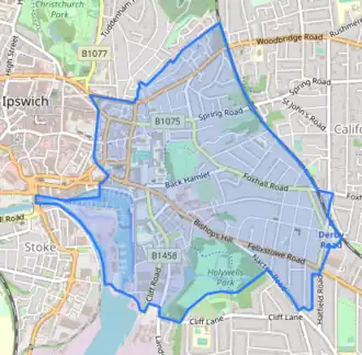 Part of the division is located in the South East Area of Ipswich and comprises part of Alexandra and Holywells wards of Ipswich Borough Council.[1] It was created in 2004 following recommendations from the Boundary Committee for England that the proposed University Division be renamed St. Helen's Division.[2]