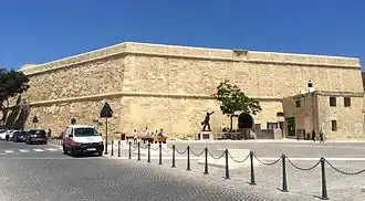 St James Cavalier was one of the first buildings to be built in Valletta, along with the Church of Our Lady of Victories and the rest of the fortifications.[3] The cavalier was built as a raised platform on which guns were placed to defend the city against attacks from the landward side, in the area where the town of Floriana was later built. As well as prohibiting entry, St James could also threaten those who had already breached the city's defences. It was linked to Saint John's Cavalier by a now-blocked underground passageway.[4]