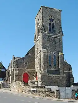 A turnpike was built in 1836 connecting St Leonards-on-Sea to the main road to London (the present A21), cutting out the former indirect route via Hastings, Ore and The Ridge.[8] St Leonards Warrior Square railway station was opened nearby in February 1851,[9] and this inland part of St Leonards-on-Sea became a new growth area housing mostly working-class people.[6] The construction of an Anglican place of worship, Christ Church, in 1860,[10] was soon followed by the establishment of a Nonconformist community who needed a church of their own: Protestant Nonconformity was thriving in the Hastings area by the mid-19th century, in common with many other parts of Sussex.[11] James Griffin, a local Congregationalist, founded the church in 1863,[12] and building work started on 23 February 1864 when the foundation stone was laid. The first service at St Leonards-on-Sea Congregational Church was held on 27 October of that year.[13] Thomas Spalding, board member of Spalding & Hodge and the owner of Ore Place (formerly the manor house of the nearby village of Ore),[14] donated locally quarried sandstone,[15] and the design and building work were credited to William Habershon and his pupil Edgar Brock.[12] As a Grade II listed building it is mistakenly credited to Edward Habershon's brother William; but it was Edward who was employed in the Habershon-Brock partnership.[12][16] The partnership were prolific in the mid-19th century; most of their work was on Anglican churches such as the new St Helen's Church at Ore, St Andrew's Church (now demolished) in central Hastings and the former St Peter's Church at Baldslow, and further afield in Sussex in places such as Hove (St John the Baptist's Church), Ebernoe, Copthorne, Ashurst Wood and Scaynes Hill.[17][18]