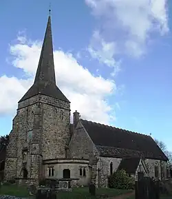 By the late 11th century, a simple single-room stone building existed on the high, open ridge upon which the village developed. A series of medieval expansions doubled its size by the 15th century, and the present building has changed little since then—despite a Victorian restoration overseen by architect R. H. Carpenter. A major addition was the heavily buttressed Perpendicular Gothic west tower, topped with a tall broach spire and containing a peal of ancient bells. The large, steeply terraced churchyard also serves as a public cemetery and has far-reaching views across the Weald. The original dedication to Saint Margaret of Antioch fell out of use for many centuries until a researcher rediscovered it. The church serves a large rural parish which was reduced in size in 1882 when two residents of the hamlet of Highbrook paid for an additional church to be built there. English Heritage has listed it at Grade I for its architectural and historical importance.