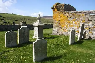 St. Mary's Church can be found on the northwest side of the island of Wyre in Orkney, Scotland. The church and surrounding cemetery lie at the bottom of the hill where the ruined medieval fort, Cobbie Row's Castle stands. The roofless Romanesque style chapel was constructed of local rubble and lime mortar. The building dates from the mid to late 12th century. It consists of a rectangular nave and chancel. The nave measures 5.87 m (19.3 ft) by 3.9 m (13 ft) and the chancel is 2.42 m (7 ft 11 in) by 2.2 m (7 ft 3 in). A round-arched door leads into the nave, which is separated from the chancel by another archway.[1] There are three small windows in the south wall. The remains of the original plaster are evident in both the nave and the chancel. The walled cemetery has been enlarged over time and continues to be used.[2][1]