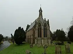 The church is of brown and grey rubble stone with limestone dressings. Above the west entrance door is a rose window, given by Lady Ashburton in memory of her husband.[4] At the east end is a polygonal apse, whose gables have two-light bar tracery windows. There are four sets of three tall lancet windows in the side walls of the church.[2] The steep roof is of purple and grey-green slates in a diamond-shaped pattern. There is a belfry with two bells between the nave and the chancel.[4]