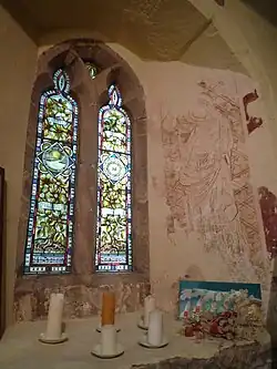 There is a 14th-century wall painting on the west jamb of the south-west window of the chapel, probably of the Virgin and Child. The font is 12th-century, with a modern base. There is a chest dating from about 1300, carved from a single oak log.[2][4]