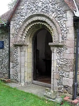 The most distinctive features of the church are its two surviving Norman-era structures: the south doorway and the chancel arch. These are densely and richly carved with a wide range of decorations, including bizarre monsters and unusual beakhead-shaped designs.[7][9][21] The latter are rare in Sussex – only St Mary's Church at Broadwater and St Mary de Haura Church at Shoreham-by-Sea have similar designs.[7] The doorway, whose door has decorative strap hinges, has three layers of carvings in its semicircular arch; they are in the form of chevrons, stars and grapes.[6][7] The chevrons form a zigzag pattern and reach the jambs and capitals; the outside face has the grape-like motifs in the angles where these meet, and the labels (horizontal elements) have the repeating star pattern.[22][23] Nikolaus Pevsner describes the carvings as "keeping inside the established pattern" of such work, and not displaying the "extraordinary ... [simultaneously] mannered and extrovert" details of the carved doorway at St Mary's Church at nearby Climping.[5][24]