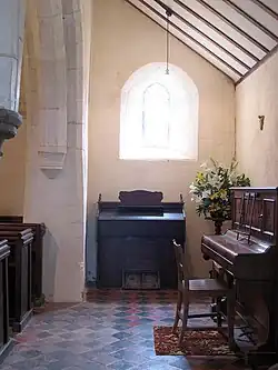 The oldest internal fitting is a 12th-century font of Caen stone, with a round bowl, foliage decoration in the form of honeysuckles, decorative mouldings and an arcade-style motif with scallop-shaped capitals.[4][7][9] An "interesting"[27] plain Jacobean pulpit of the early 17th century, with legs rather than the usual single stem,[4][9][13] may have been made by a local craftsman. There are 15th-century panelled pews in the south aisle.[7] Above the chancel arch there are two 18th-century funerary hatchments.[7][13]