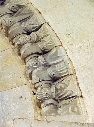 Inside, the carvings around the chancel arch – dating from about 1140, like the doorway – consist of "an amazing congregation of grotesque monsters",[21] "boggle-eyed ... with beaks, tongues and squid-like tentacles, that frown and glare at visitors below".[6] The roll mouldings of the arch are held in the beaks of these "fearsome",[9] "wide-eyed horrors".[21] Such "beakhead" decoration is a little-understood feature of Late Norman architecture:[9] in churches, it may have been used to capture the congregation's interest or to inspire fear and awe.[6] The moulding has two orders (recessed jambs which together form a chamfered opening):[25] in contrast to the lavishly decorated outer order, the inner order is plain.[9][10]