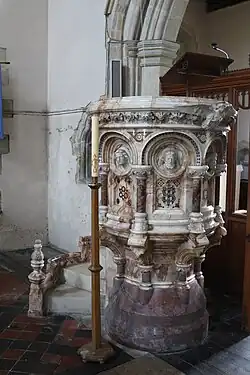 The eastern half of the south wall of the chancel was rebuilt in the second half of the 15th century, and the clearstory was added to the nave. The south porch was added at the same time, but has subsequently been rebuilt. The church was restored in 1863[3] under the supervision of the architect J. Chatwin. New bells were inserted in the tower. The stonework of the pillars was renewed where it had deteriorated. The nave, aisles and chancel were paved with blue and red Stafford tiles and the heating apparatus was provided by Rimington of Yorkshire. New seating was provided of stained deal.
