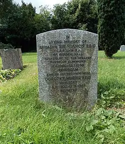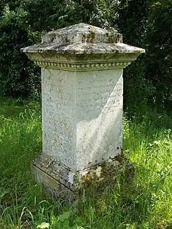 Further churchyard grave markers are to the murdered parish constable Henry Trigg;[12] to Thomas Beard (died 1800?); and to Mary Ann Griffin (died 1899 aged 34), wife of Lewis Phillips of Berden Hall. The Beard stone contains a serpentine moulding at each side of the top meeting a central circular moulded device, defining three engraved fields, and all with carved pictorial details, the central an angel holding an anchor. An overgrown slab running from the stone contains a similar circular engraved device. The Griffin stone is chamfered-arch topped with inset floral carving, semi-circular side columns topped with floriate capitals, and inlaid inscriptions. Near to the Griffin stone is a plinth tomb with moulded base, and overhanging top with dentils below and a pyramid top. It is to members of the Roberts family, one of whom was Roland Brandram Roberts of Kirimetiya Estate, Ceylon (died 1910 aged 46), who was cremated at Golders Green, with his ashes interred in Berden graveyard. Two marble and granite sarcophagus-style tombs are to the north of the church; one to George Seabrook (died 1885); the other Thomas Seabrook (died 1847) and his wife, Elizabeth (died 1871). George and Thomas Seabrook were of Berden Priory. A further headstone is to Brigadier Sir Francis Smith Reid and his wife. Reid was a senior British Army officer during and after the Second World War, and Secretary to the Speaker of the House of Commons.