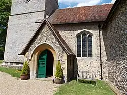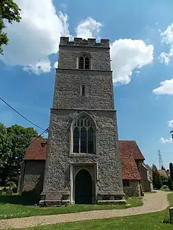 The church's 15th-century three-stage tower is of Gothic Perpendicular style. Of approximately 12 feet (4 m) square in footprint, the bottom stage contains a door and window on its west face. The restored 15th-century door, faced with decorative hinges, is set within a chamfered arch topped by a rectilinear enclosure; between this and the arch are spandrels with inset rosettes containing quatrefoils. Around the top of the squared surround is a rectilinear hood mould. Above the door is a restored 15th-century Perpendicular pointed arch window set within a chamfered reveal. The window is of three lights up to the outer arch spring, each ending in a trefoil-headed arch. Above the lights is panel tracery—a Perpendicular style of upright straight openings above lower lights—leading to further arches. Around the window opening arch is a hood mould. The second tower stage west side, slightly set back, contains a narrow arrowslit window rebated within an arch, possibly 15th-century. Above the apex of the window opening is a small round stone with a carved diagonal cross inset. On the south face is a c. 2000 tower clock; circular, convex, and with gold numerals. The belfry third stage, set back again, contains a restored 15th-century window opening on all sides, all of two lights with trefoil heads, louvred, and ending in a flattened pointed arch with hood mould. The tower parapet is deeply embattled. Inset behind the battlements is a four-sided pyramid stub spire. An angled buttress runs almost to the height of the first stage at the nave ends of the north and south sides—English Heritage states there are no tower buttresses. From the bases of the buttresses is a simple moulded socle (plinth) topped by a cill band—angled projection that allows water to flow from a building face— running around the tower.[1][21][22]