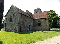 The present church nave dates from the 12th century, with the chancel and transepts from the 13th, and the tower from the 15th. The chancel was rebuilt in part, and the church restored, in the 19th century at which time a south porch was added.[1][5][6][7] A complete 1868 restoration was carried out at a cost of £2000.[8] Before the 1868 restoration the church was recorded as containing a north and a south aisle, and a tower of four bells;[9] and in 1818 as containing five bells.[10]