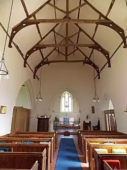The church walls and ceilings are rendered and painted white throughout. All windows are glazed with translucent rectilinear glass panels, in clear, red or blue. All flooring is plain red tiling except on the raised chancel sanctuary behind the altar rail where there is added bands of black, white and brown. The chancel east window is part of the 19th-century restoration, but with the use of a c. 1270 capital detail. The c. 1270 chamfered rebated chancel arch has a hood mould finished with human head label stops on both chancel and nave sides. Set within the arch is a further chamfered arch supported by responds—half-piers attached to walls supporting an arch—of semi-circular columns with flat-face faceted moulded bases, and foliate capitals that have been part-restored. A 19th-century-added arched squint is on each side of the chancel arch, each with a chamfered rebate as part of the arch. Set above each squint on the chancel side is a gable as moulding with, at its spring and point, a carved foliated detail. Within the chancel is a 14th-century piscina containing a quatrefoil shaped drain.[21][22]