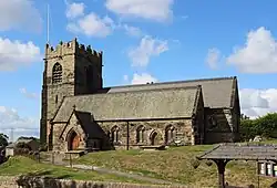 The church is built from coursed and squared rubble in large blocks with a roof of Westmorland slate with ridge cresting. Its plan consists of a west tower, a nave, north and south aisles with gable roofs, a south porch, and a chancel.[1] Heraldic shields over the west door date it between 1504 and 1521.[5] The tower is in three stages with angle buttresses and an embattled parapet.[1]
