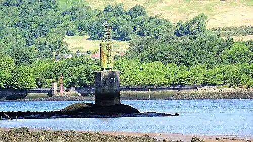 This small rock is exposed towards low tide and is partly covered by the navigation aid known as St Patrick's Light.[10] Running down to the rock from the Renfrewshire shore is the remnants of the old North Jetty. It at present lies on the edge of the deeper waters of the River Clyde at this point that remain inundated even at low tide.