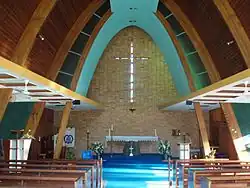 The dominant element of the church's design is the parabolic arched roof over the nave and sanctuary. Clad in metal roof sheeting, the parabolic form is created by a reinforced concrete arch at the front, regularly spaced laminated timber arches throughout the interior and a brick end wall at the rear. A raised strip of roofing along the apex is clad in opaque sheeting.[1]