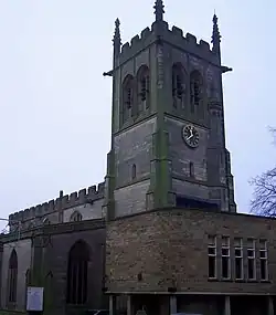 The late 18th century saw galleries added to the nave but, in 1852 the chancel was restored and the pews, along with the impropriator's (lay rector's, see Chancel repair liability) gallery removed. Plaster was also removed and old roof timbers exposed.[5] In the same decade the chancel and aisles were again restored and the large galleries at the west end of the nave removed. 1865 saw the south porch removed, the organ chamber made at the east end of the north aisle. In 1898, the west end of church and tower rebuilt were entirely rebuilt with great sympathy for the existing ancient east end of the church. In 1970, the present church and parish rooms, including meeting rooms, coffee rooms, office, kitchen and toilet facilities were added to the west end below the tower.