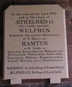 The charter then defines the boundaries of the estates given by Wulfrun in considerable detail. Some of the places named are fairly easy to recognise from their modern or medieval forms: Arley, Bilston, Willenhall, Wednesfield, Pelsall, Ogley Hay, Hilton, Hatherton, Kinvaston, Featherstone. Others raise problems. These were discussed in the notes to a collection of Anglo-Saxon charters prepared for publication by C. G. O. Bridgeman in 1916, and his conclusions have been generally accepted. These include the identification of Eswick as Ashwood, Staffordshire, as it was Haswic in the Domesday Book, and of the second Hilton as a village of that name near Ogley and Wall, Staffordshire.[7] The ten hides of land at Wolverhampton were probably those which Wulfrun herself had received from Ethelred II by a charter of 985.[8][9] These were specified as ix uidelicet in loco qui dicitur aet Heantune, et aeque unam manentem in eo loco quae Anglice aet Treselcotum uocitatur ("nine plainly in the place which is called Hampton and equally the remaining one in the place called by the English Trescott"):[10] the latter is a place on the River Smestow to the west of Wolverhampton. The Arley lands probably came from a grant which King Edgar the Peaceful had made to Wulfgeat, a relative of Wulfrun, in 963.[11][12] In 1548, before the alleged discovery of Wulfrun's charter, Edgar himself was generally accepted as the founder of the College.[13] Wulfgeat was an important adviser to Ethelred, a king who proverbially, as the Unready or Redeless, did not accept good advice: he fell into disgrace[14] and Wulfrun's grants were partly to make amends for his perceived injustices. When Wulfgeat died in about 1006, he left four oxen to the church at Heantune.[15]
