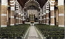 St Saviour's was built as mission church of Christ the Saviour, Church Ealing. The Rector of Christ the Saviour raised funds for four daughter churches; St John's Church, Ealing, St Stephen's Church, Ealing, St Peter's Church, Ealing, and St Saviour's.[2] The prolific church architect, George Fellowes Prynne, was chosen to build the new Church. Prynne had designed and restored churches across the country, particularly in London and the South West. He also lived in Ealing on the adjoining Street, and attended Christ Church. The project was of substantial personal significance to him.[3]