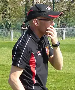 Like Rampillon, many youth team managers were promoted to the position of head coach at the whim of sporting events. In 1941, the war and the temporary departure of Jean Batmale prompted Louis Bonneville to take charge of the first team for a season, assisted by player Émile Scharwath.[3] In 1975, the dismissal of René Cédolin prompted Frédo Garel, coach of the youth and amateur teams,[101] to step in for two games.[102] Internal promotion subsequently became a fully-fledged choice of the club's directors. In 1976, Claude Dubaële was promoted to head of the professionals.[103] A year and a half later, Alain Jubert followed suit,[104] after Dubaële was dismissed for economic reasons.[105] Finally, Yves Colleu, who had become an assistant coach after joining the technical staff at the training centre,[106] became the club's head coach, replacing Michel Le Milinaire, who was forced to retire.[107] Only staying on for the 1996-1997 season, he subsequently became Paul Le Guen's appointed assistant coach, following the latter throughout his career.[108]