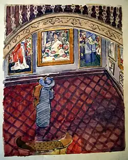 In the second decade of the century, and thus shortly after Roger Fry's Manet and the Post-Impressionists at the Grafton Galleries in 1910–11, the Stafford Gallery began to show more avant-garde, particularly French, works.[6] In 1911 there were exhibitions of paintings by Courbet (March),[7] Sickert (June),[8] Gauguin and Cézanne (November),[9] and possibly Camille Pissarro in October;[10] work by Vincent van Gogh may also have been shown.[6] The Gauguin show is the subject of Spencer Gore's painting Gauguins and Connoisseurs at the Stafford Gallery. In 1912 there were exhibitions of paintings by the Scottish Colourist painter J.D. Fergusson in March,[11] and drawings by Picasso in April.[12]