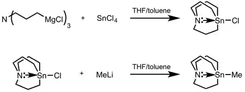 The first carbastannatrane was reported in 1984 by Jurkschat and Tzschach.[5] By reaction of an amino-triGrignard reagent with tin(IV) chloride to yield the stannatrane chloride, which was treated with methyl lithium to yield the corresponding methyl stannatrane. Based on a very small methyl J(119Sn–13C) coupling constant of 171 Hz, it was determined that the tin center of methyl stannatrane was indeed pentacoordinate, indicating nitrogen coordination.